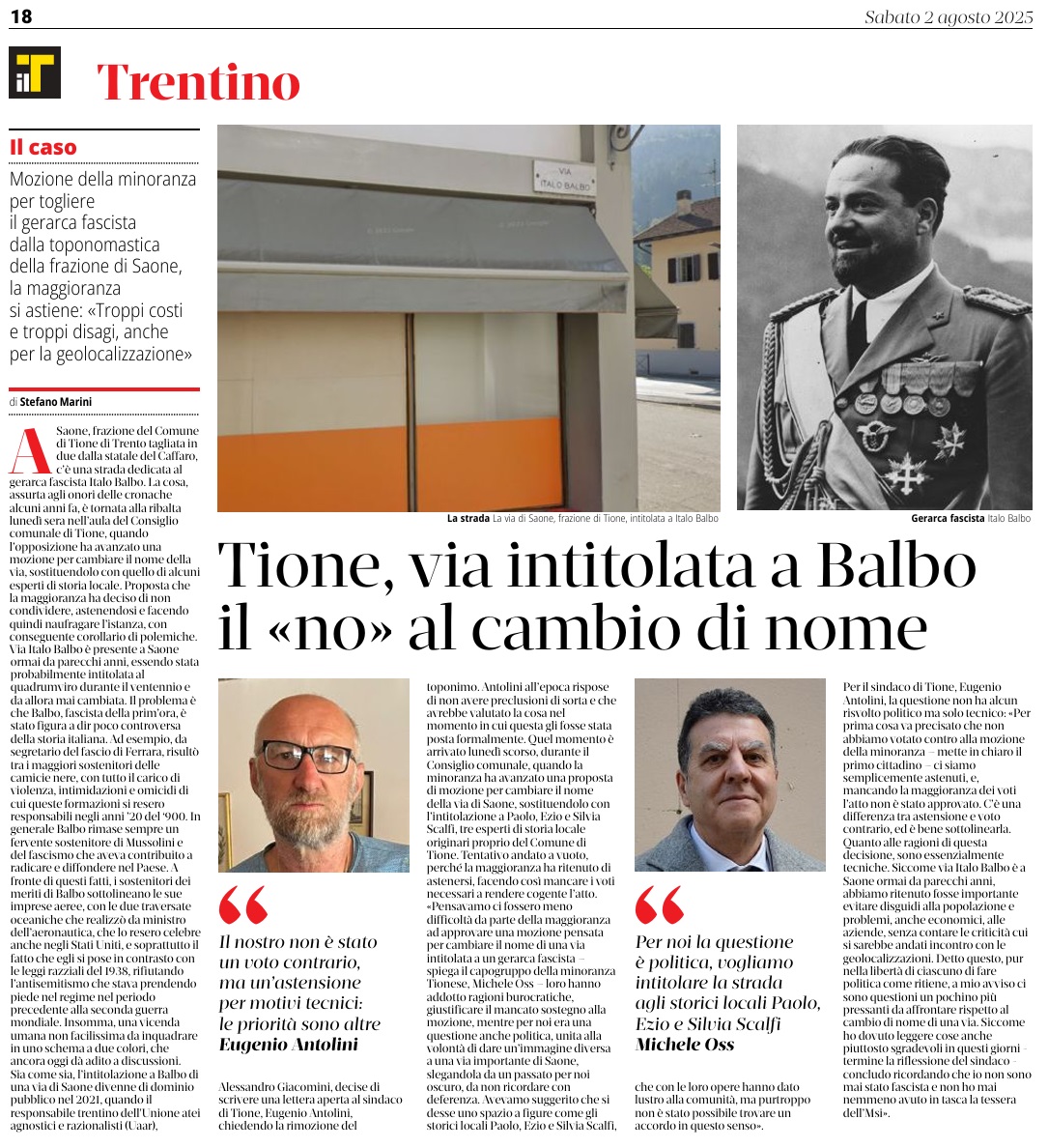 Tione , via intitolata a Balbo il no al cambio di nome  |